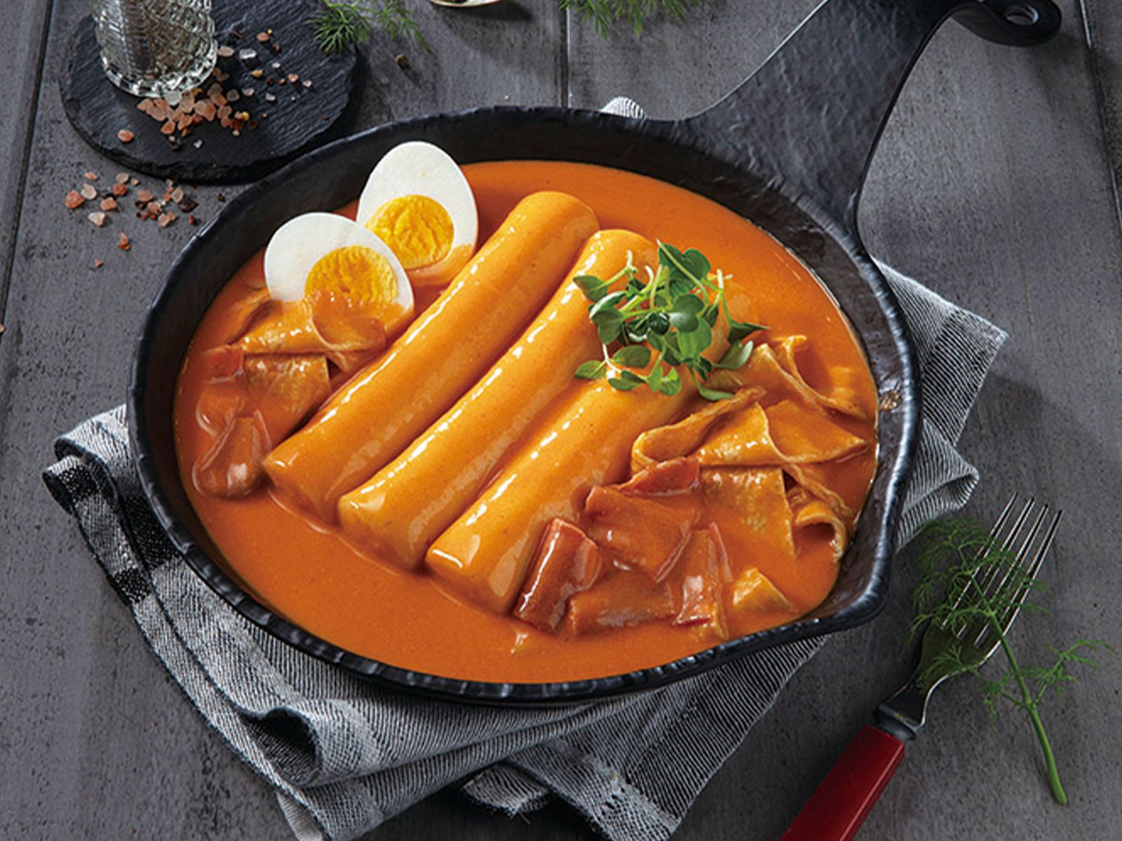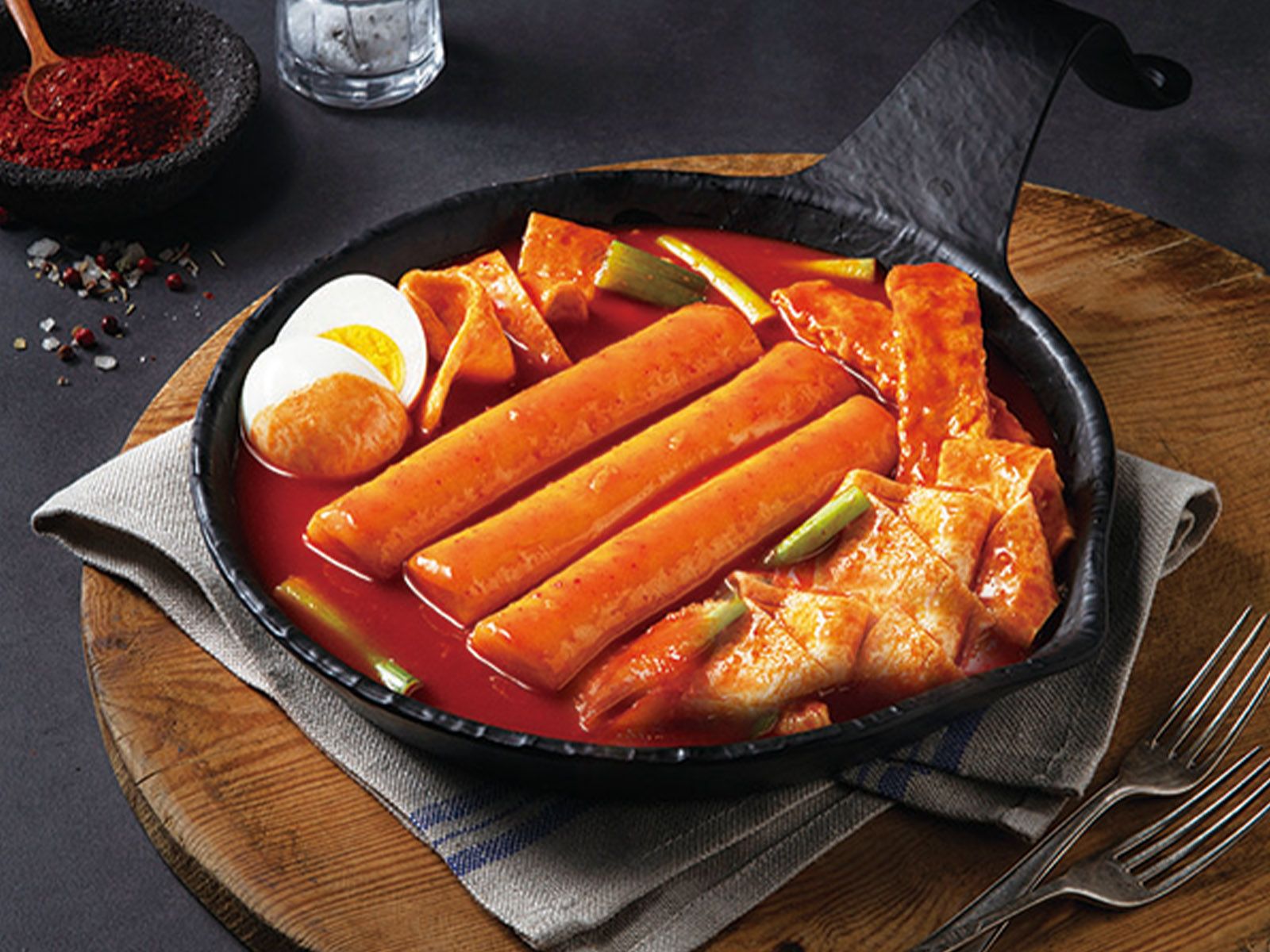 Korean-style fried rice cakes are made by deep-frying fresh garaetteok (cylindrical rice cakes) until they are crispy on the outside and chewy on the inside, often served as a savory or sweet snack.